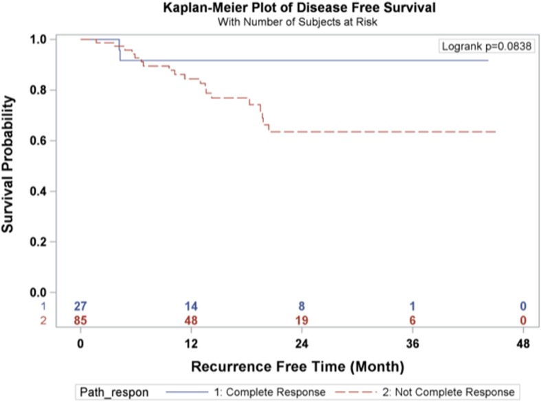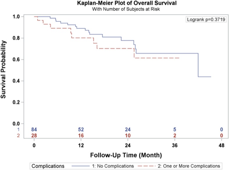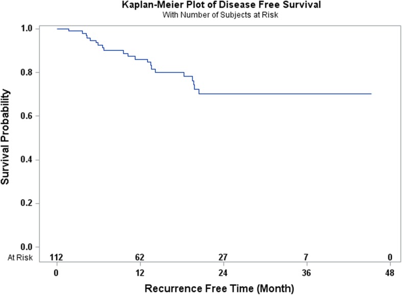 Methods: This is a retrospective observational study of 112 patients diagnosed with esophageal carcinoma who underwent total laparoscopic and thoracoscopic Ivor Lewis esophagectomy from May 2014 to May 2018. All of the patients received neoadjuvant chemoradiation consisting of 45 to 50.4 Gray of radiation and 3-5 cycles of carboplatin and paclitaxel chemotherapy. Perioperative morbidity and 90-day mortality were recorded. The overall and disease-free survival rates were estimated by Kaplan Meier techniques.