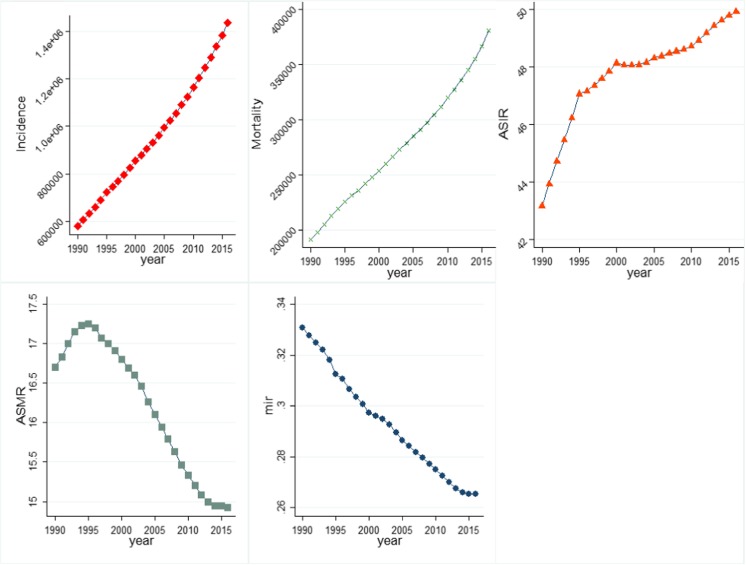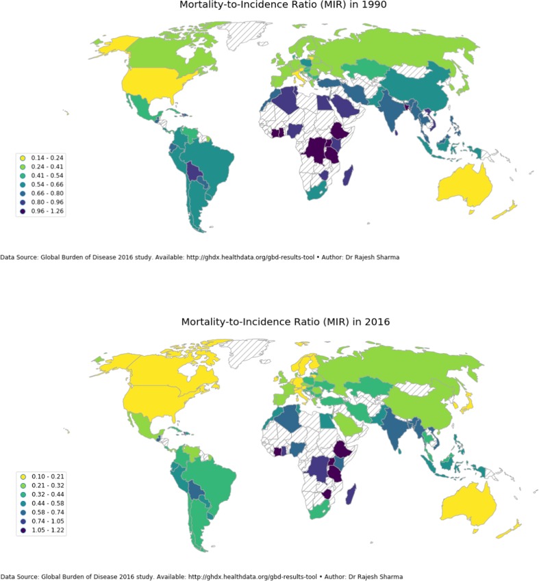 Results: Globally, 1.4 million new cases of prostate cancer arose in 2016 claiming 380,916 lives which more than doubled from 579,457 incident cases and 191,687 deaths in 1990. In 2016, the age-standardised incidence rate (ASIR) was the highest in very high-HDI countries led by Australia with ASIR of 174.1/100,000 and showed a strong positive association with HDI (r = 0.66); the age-standardised mortality rate (ASMR), however, was higher in low-HDI countries led by Zimbabwe with ASMR of 78.2/100,000 in 2016. Global MIR decreased from 0.33 in 1990 to 0.26 in 2016. Mortality-to-incidence ratio (MIR) exhibited a negative gradient (r = - 0.91) with human development index with tenfold variation globally with seven countries recording MIR in excess of 1 with the USA recording the minimum MIR of 0.10.