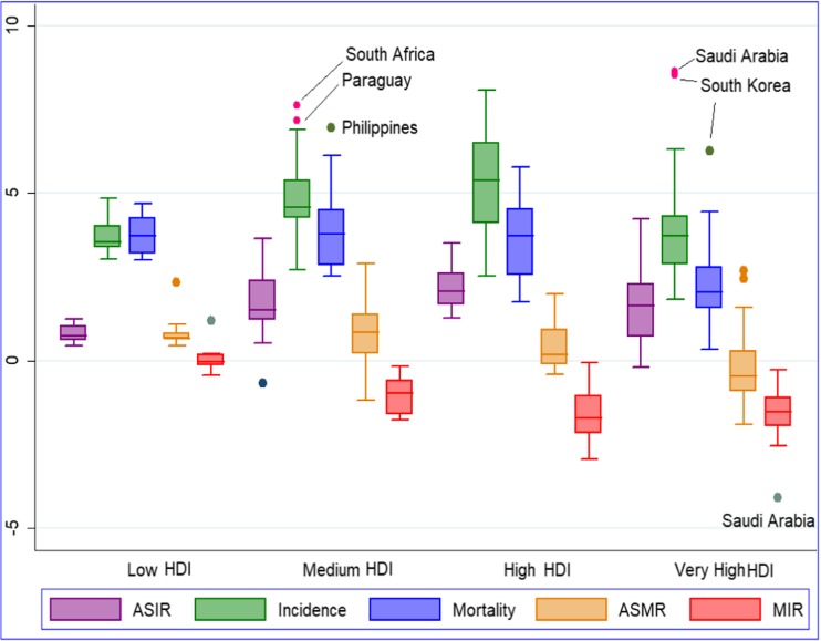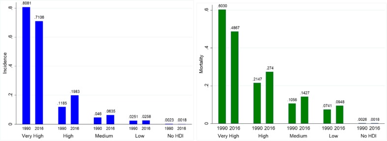 Subject and methods: The estimates of the incidence and mortality of prostate cancer for 87 countries were obtained from the Global Burden of Disease 2016 study for the period 1990 to 2016. The human development level of a country was measured using its human development index (HDI): a summary indicator of health, education, and income. The association between the burden of prostate cancer and the human development index (HDI) was measured using pairwise correlation and bivariate regression. Mortality-to-incidence ratio (MIR) was employed as a proxy for the survival rate of prostate cancer.