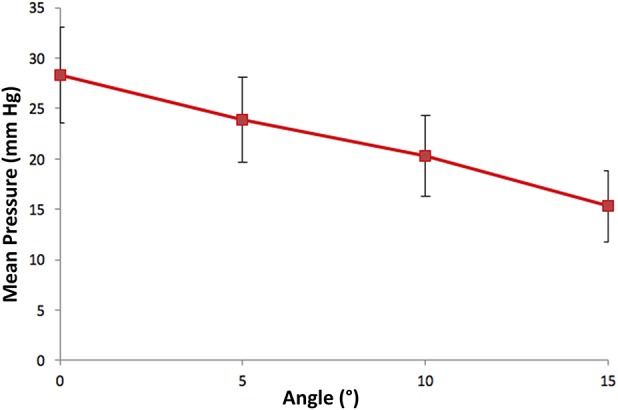 Results: Compared with baseline (0° or no Trendelenburg) there was a reduction in pressure of 4.4 (15.5%) at 5° of Trendelenburg (p = 0.203), 8 (28%) at 10° of Trendelenburg (p = 0.022) and 13.1 (46%) at 15° (p = 0.006). These results were maintained regardless of the sequence of positions used in each patient (0°, 5°, 10°, 15°).
