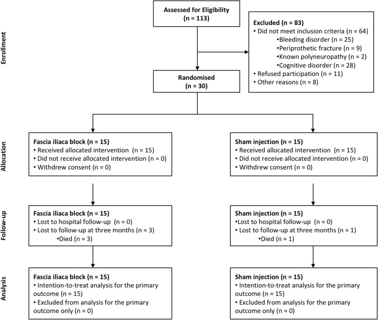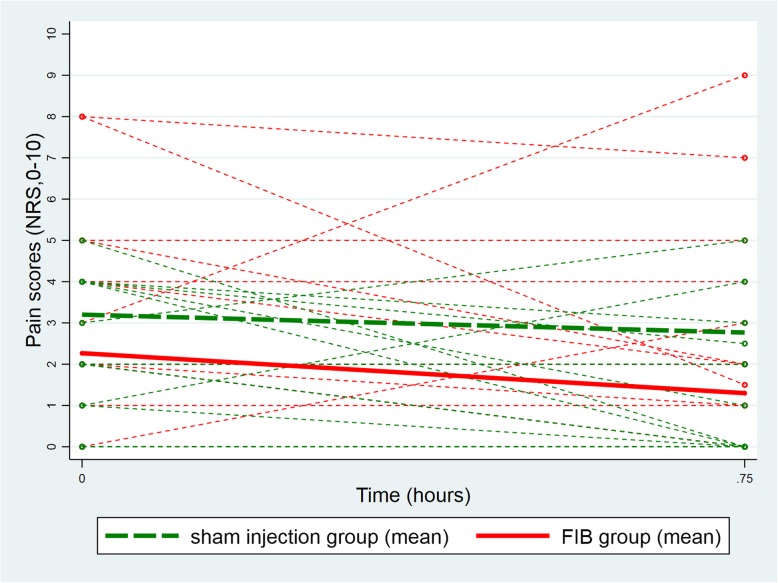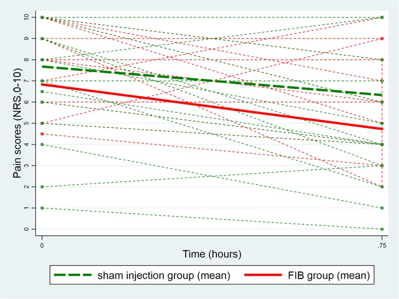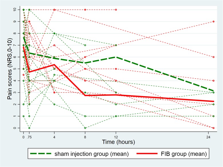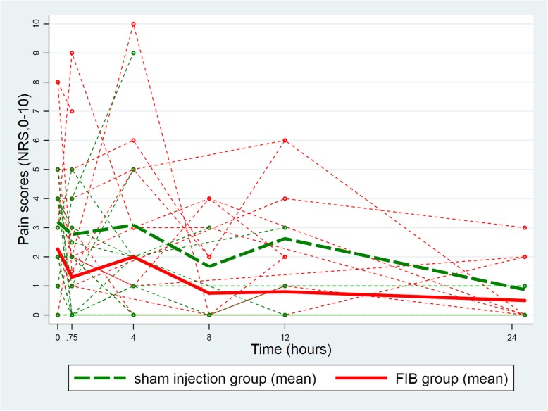 Results: At baseline, the fascia iliaca group had a lower mean pain score than the sham injection group, both at rest (difference = - 0.9, 95%CI [- 2.4, 0.5]) and on movement (difference = - 0.9, 95%CI [- 2.7; 0.9]). These differences remained 45 min after the procedure and the two longitudinal pain score profiles were parallel both for patients at rest and on movement (test of parallelism for patients at rest p = 0.53 and on movement p = 0.45). The same parallel change in pain scores over time was observed over 24 h of follow-up (test of parallelism for patients at rest p = 0.82 and on movement p = 0.12). These results were confirmed after adjustment for gender, ASA score, and cumulative sums of intravenous morphine received pre-procedure and during-follow-up. In addition, there was no difference between the two groups in total cumulative intravenous morphine consumption at 24 h.