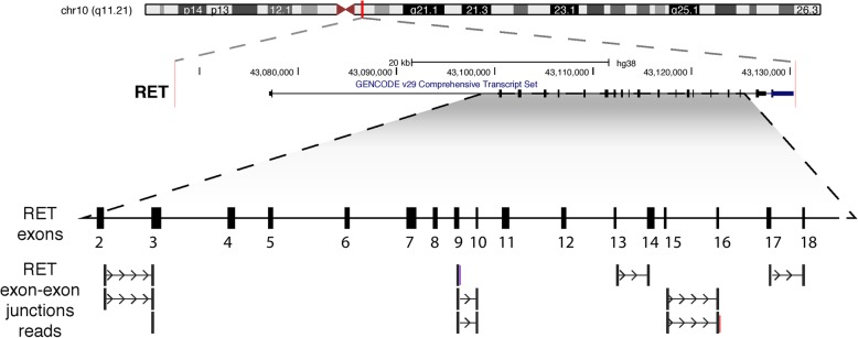 Methods: We integrated Multiplex Ligation-dependent Probe Amplification (MLPA) and whole exome sequencing (WES) to search for copy number alteration (CNA) in the RET gene in MTC samples and medullary thyroid cell lines (TT and MZ-CR-1). We next found reads spanning exon-exon boundaries on RET, an indicative of retrocopy. We subsequently searched for RET retrocopies in the human reference genome (GRCh37) and in the 1000 Genomes Project data, by looking for reads reporting joined exons in the RET locus or distinct genomic regions. To determine RET retrocopy specificity and recurrence, DNA isolated from sporadic and MEN 2-associated MTC (n = 37), peripheral blood (n = 3) and papillary thyroid carcinomas with RET fusion (n = 10) samples were tested using PCR-sequencing methodology.