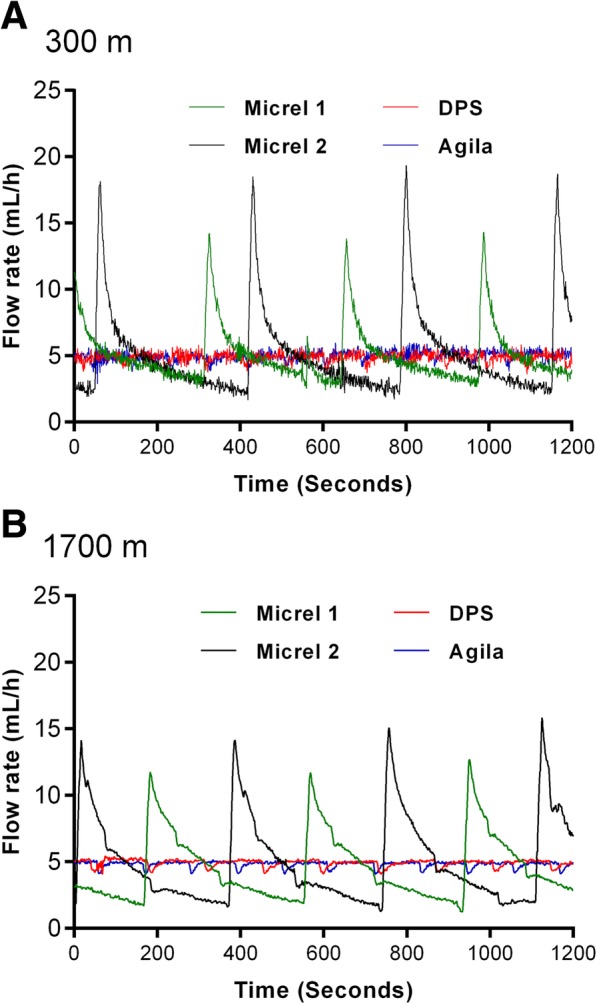 Results: Using method A, no significant differences were found in median flow rates and interquartile range depending on device and altitude for a prespecified 10-mL/h flow. However, method B showed that low-weight SIPs delivered multiple sequential boluses with substantial variations (1.2-15.8 mL/h) rather than a prespecified continuous 5-mL/h flow. At 1700 m altitude, the interquartile range of delivered flows increased only for low-weight devices (p for interaction< 0.001).