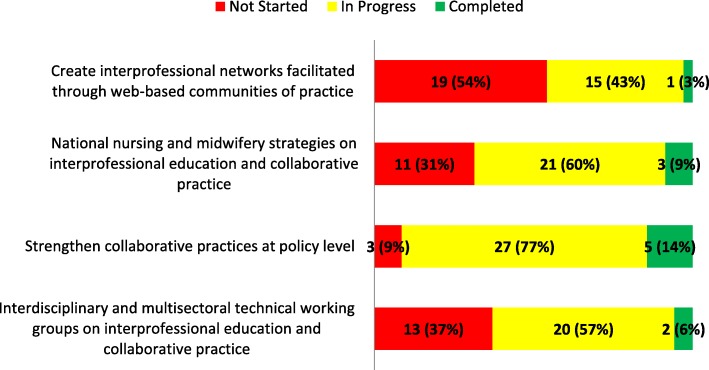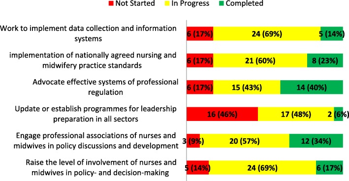 Results: Thirty-five countries completed the survey. Summing up the implementation frequency of interventions across all thematic areas, 19% of responses were in the category of "completed"; 55% were reportedly "in progress" and 26% indicated a status of "not started". Findings reveal a stronger level of implementation for areas of nursing and midwifery development related to enhancing regulation and education, creating stronger roles for professional associations and policy strengthening. Leadership and interprofessional collaboration are intervention areas that were less implemented.