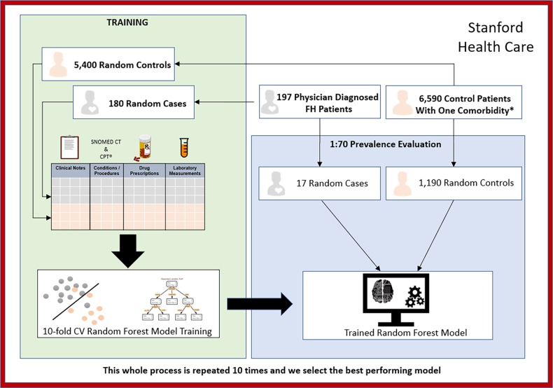 Familial hypercholesterolemia (FH) is an underdiagnosed dominant genetic condition affecting approximately 0.4% of the population and has up to a 20-fold increased risk of coronary artery disease if untreated. Simple screening strategies have false positive rates greater than 95%. As part of the FH Foundation's FIND FH initiative, we developed a classifier to identify potential FH patients using electronic health record (EHR) data at Stanford Health Care. We trained a random forest classifier using data from known patients (n = 197) and matched non-cases (n = 6590). Our classifier obtained a positive predictive value (PPV) of 0.88 and sensitivity of 0.75 on a held-out test-set. We evaluated the accuracy of the classifier's predictions by chart review of 100 patients at risk of FH not included in the original dataset. The classifier correctly flagged 84% of patients at the highest probability threshold, with decreasing performance as the threshold lowers. In external validation on 466 FH patients (236 with genetically proven FH) and 5000 matched non-cases from the Geisinger Healthcare System our FH classifier achieved a PPV of 0.85. Our EHR-derived FH classifier is effective in finding candidate patients for further FH screening. Such machine learning guided strategies can lead to effective identification of the highest risk patients for enhanced management strategies.