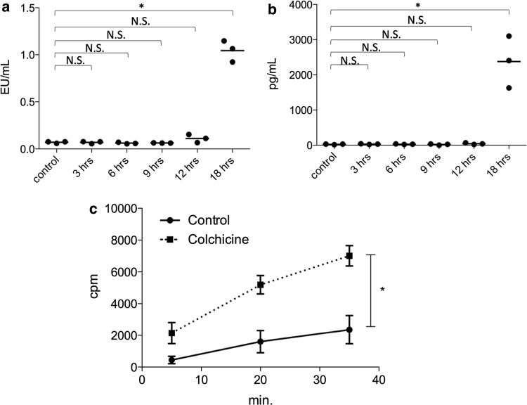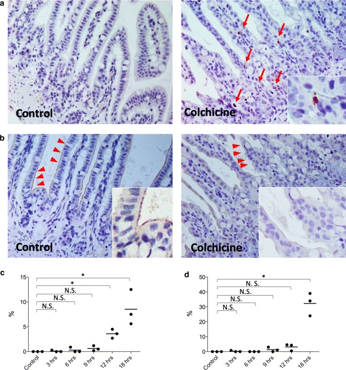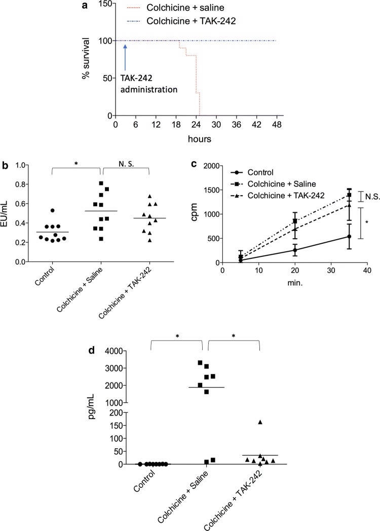 Results: We observed villus height reduction and increased numbers of apoptotic cells in the gastrointestinal epithelium of colchicine-treated mice. Both intestinal permeability and serum endotoxin levels were higher in colchicine-treated mice than in control mice. Although colchicine-poisoned mice died within 25 h, those that also received TAK-242 treatment survived for more than 48 h.