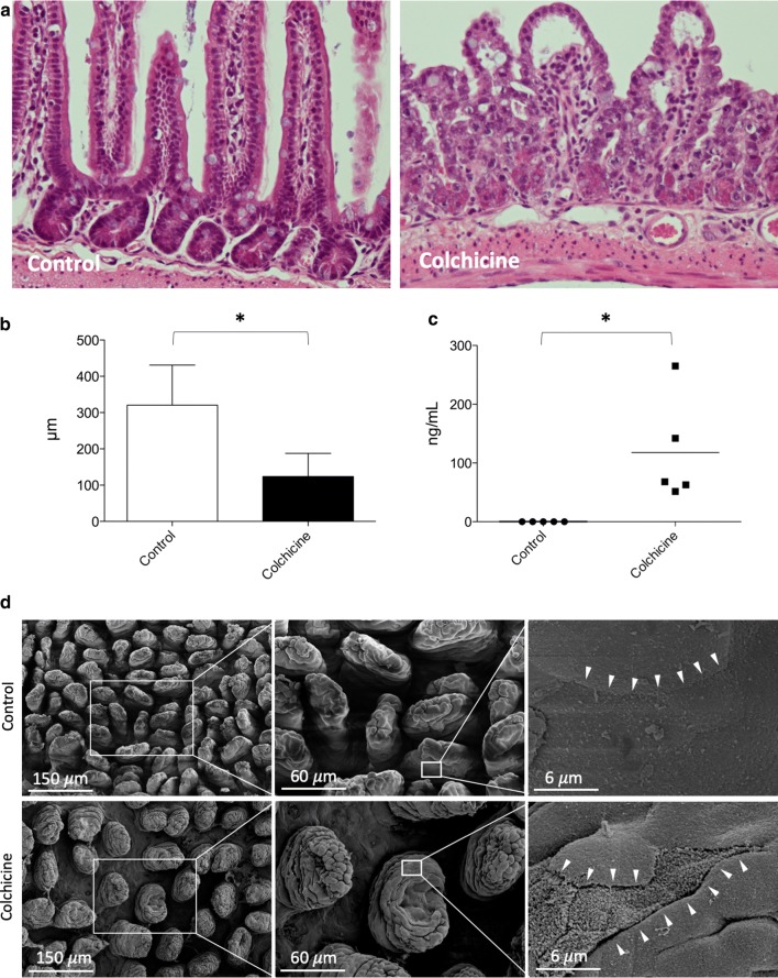Methods: Colchicine was orally administered to C57Bl/6 mice. Then, we performed histopathological analysis, serum endotoxin assays, and intestinal permeability testing. Additionally, the LPS-TLR4 signaling inhibitor TAK-242 was intraperitoneally injected after colchicine administration to analyze the therapeutic effect.