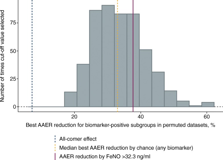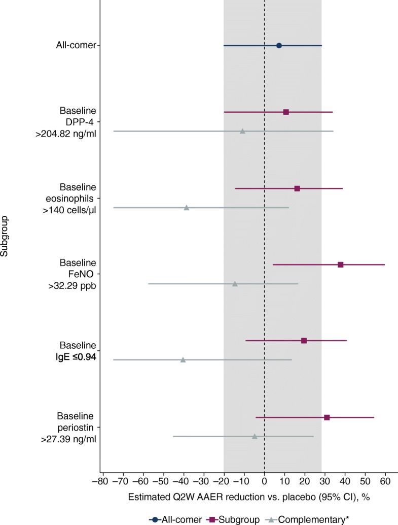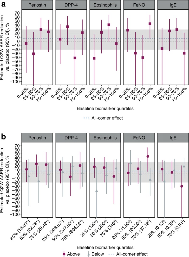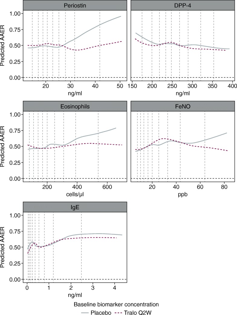Results: FeNO and periostin were identified as the only biomarkers potentially predictive of treatment effect, with cut-offs chosen by the SIDES algorithm of > 32.3 ppb and > 27.4 ng/ml, respectively. The FeNO > 32.3 ppb subgroup was associated with greater AAER reductions and improvements in key secondary endpoints compared with the periostin > 27.4 ng/ml subgroup. Upon further evaluation of AAER reductions at different FeNO cut-offs, ≥37 ppb was chosen as the best cut-off for predicting tralokinumab efficacy.
