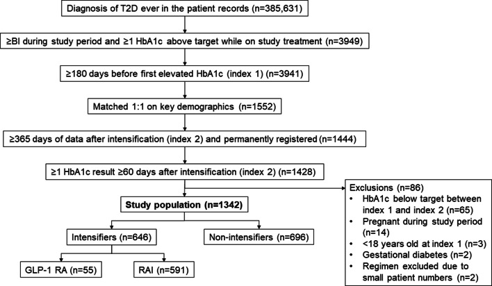 Methods: Patients with T2D with suboptimal glycemic control using BI were identified from The Health Improvement Network (THIN) database. Patients who underwent therapy intensification (intensifiers) within 12 months of index 1 (the date of the first incidence of suboptimally controlled HbA1c) were matched (1:1) to patients who did not intensify therapy (non-intensifiers). Index 2 was the date of therapy intensification for intensifiers, or a pseudo date for non-intensifiers that resulted in the same duration from index 1 to index 2 as their matched intensifier patient. Primary outcomes were HbA1c change and proportion of patients achieving the HbA1c target at 6 and 12 months post index 2.