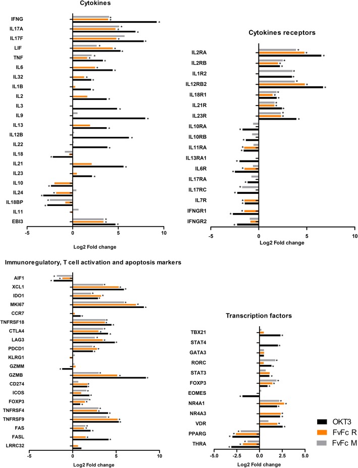 Background: Anti-CD3 immunotherapy was initially approved for clinical use for renal transplantation rejection prevention. Subsequently, new generations of anti-CD3 antibodies have entered clinical trials for a broader spectrum of therapeutic applications, including cancer and autoimmune diseases. Despite their extensive use, little is known about the exact mechanism of these molecules, except that they are able to activate T cells, inducing an overall immunoregulatory and tolerogenic behavior. To better understand the effects of anti-CD3 antibodies on human T cells, PBMCs were stimulated, and then, we performed RNA-seq assays of enriched T cells to assess changes in their gene expression profiles. In this study, three different anti-CD3 antibodies were used for the stimulation: two recombinant antibody fragments, namely, a humanized and a chimeric FvFc molecule, and the prototype mouse mAb OKT3.