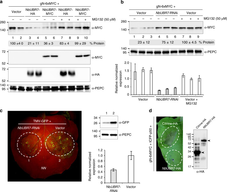 Nucleotide-binding leucine-rich repeat (NLR) immune receptors play a critical role in defence against pathogens in plants and animals. However, we know very little about NLR-interacting proteins and the mechanisms that regulate NLR levels. Here, we used proximity labeling (PL) to identify the proteome proximal to N, which is an NLR that confers resistance to Tobacco mosaic virus (TMV). Evaluation of different PL methods indicated that TurboID-based PL provides more efficient levels of biotinylation than BioID and BioID2 in plants. TurboID-based PL of N followed by quantitative proteomic analysis and genetic screening revealed multiple regulators of N-mediated immunity. Interestingly, a putative E3 ubiquitin ligase, UBR7, directly interacts with the TIR domain of N. UBR7 downregulation leads to an increased amount of N protein and enhanced TMV resistance. TMV-p50 effector disrupts the N-UBR7 interaction and relieves negative regulation of N. These findings demonstrate the utility of TurboID-based PL in plants and the N-interacting proteins we identified enhance our understanding of the mechanisms underlying NLR regulation.