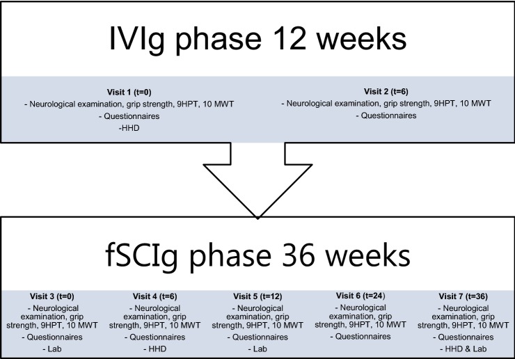 Methods: Our study consisted of two phases: the IVIg phase (visits 1-3; 12 weeks), in which patients remained on IVIg treatment, and the fSCIg phase (visits 4-7; 36 weeks), in which patients received fSCIg treatment. After visit 3, IVIg was switched to an equivalent dose and frequency of fSCIg. Outcome measures were safety, muscle strength, disability and treatment satisfaction.