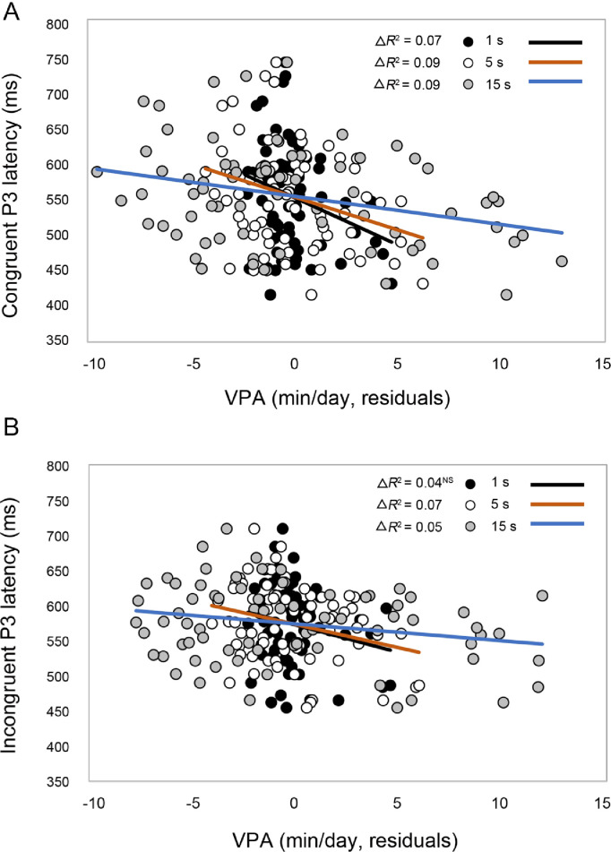 Results: Daily VPA was not related to RTmean or accuracy on either congruent or incongruent trials. In contrast, more time spent in VPA bouts lasting ≥30 s predicted shorter P3 latency across epochs and flanker congruencies (all β ≤ -0.24, all p ≤ 0.04). The associations between shorter P3 latency and the time spent in moderate-to-vigorous PA bouts lasting ≥30 s were less consistent and largely limited to congruent trials (congruent: β (-0.31, -0.34)). No significant associations were observed upon correction for false discovery rate.