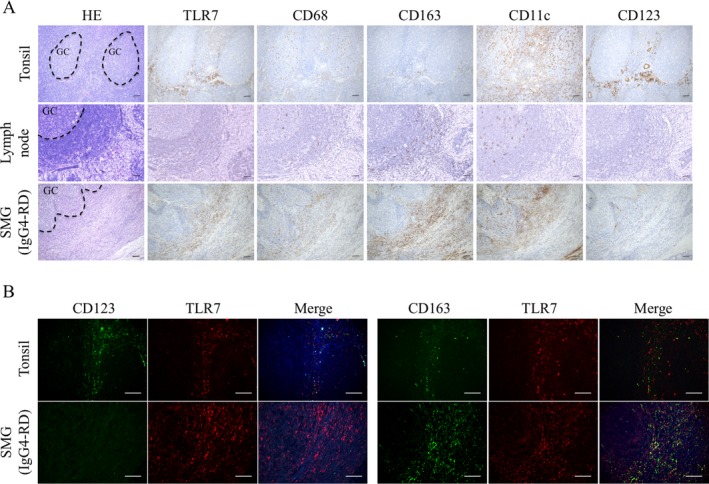 Results: In patients with IgG4-RD, TLR-4, TLR-7, TLR-8, and TLR-9 were overexpressed. Polymerase chain reaction validated the up-regulation of TLR-7 in IgG4-RD compared with the other groups. Immunohistochemical analysis confirmed strong infiltration of TLR-7-positive cells in the SGs of patients with IgG4-RD. Double immunohistochemical staining showed that TLR-7 expression colocalized with CD163+ M2 macrophages. After in vitro stimulation with a TLR-7 agonist, CD163+ M2 macrophages produced higher levels of interleukin-33 (IL-33), which is a Th2-activating cytokine. In huTLR-7-transgenic mice, the focus and fibrosis scores in SMGs, pancreas, and lungs were significantly higher than those in wild-type mice (P < 0.05). Moreover, the concentration of serum IgG, IgG1, and IL-33 in huTLR-7-transgenic mice was distinctly increased upon stimulation with a TLR-7 agonist (P < 0.05).