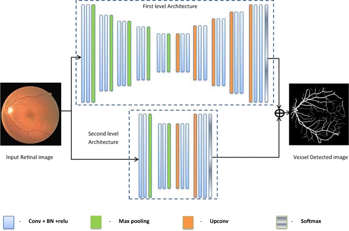 Retinal blood vessel extraction is considered to be the indispensable action for the diagnostic purpose of many retinal diseases. In this work, a parallel fully convolved neural network-based architecture is proposed for the retinal blood vessel segmentation. Also, the network performance improvement is studied by applying different levels of preprocessed images. The proposed method is experimented on DRIVE (Digital Retinal Images for Vessel Extraction) and STARE (STructured Analysis of the Retina) which are the widely accepted public database for this research area. The proposed work attains high accuracy, sensitivity, and specificity of about 96.37%, 86.53%, and 98.18% respectively. Data independence is also proved by testing abnormal STARE images with DRIVE trained model. The proposed architecture shows better result in the vessel extraction irrespective of vessel thickness. The obtained results show that the proposed work outperforms most of the existing segmentation methodologies, and it can be implemented as the real time application tool since the entire work is carried out on CPU. The proposed work is executed with low-cost computation; at the same time, it takes less than 2 s per image for vessel extraction.