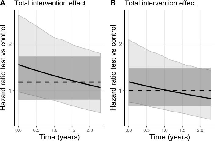 Results: By using joint models we are able to disentangle baseline confounding from the intervention effect and moreover, to investigate the association between longitudinal patient information and the time until clinical dementia diagnosis.