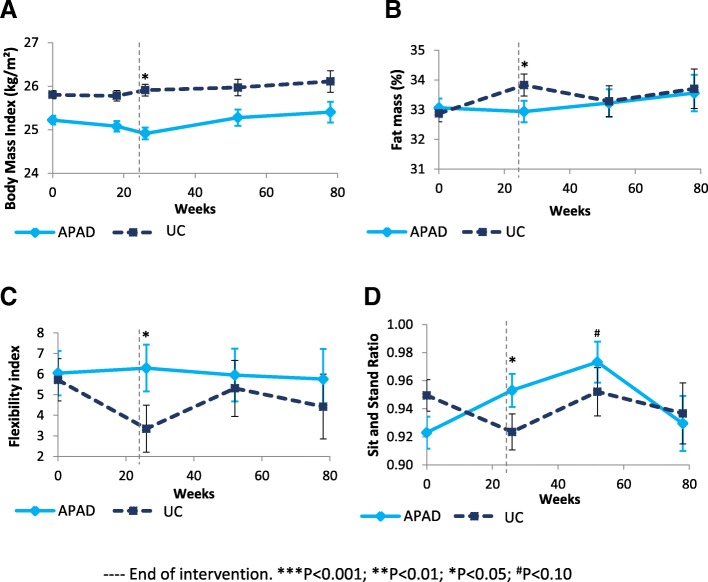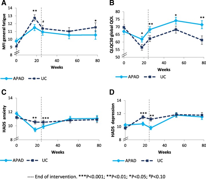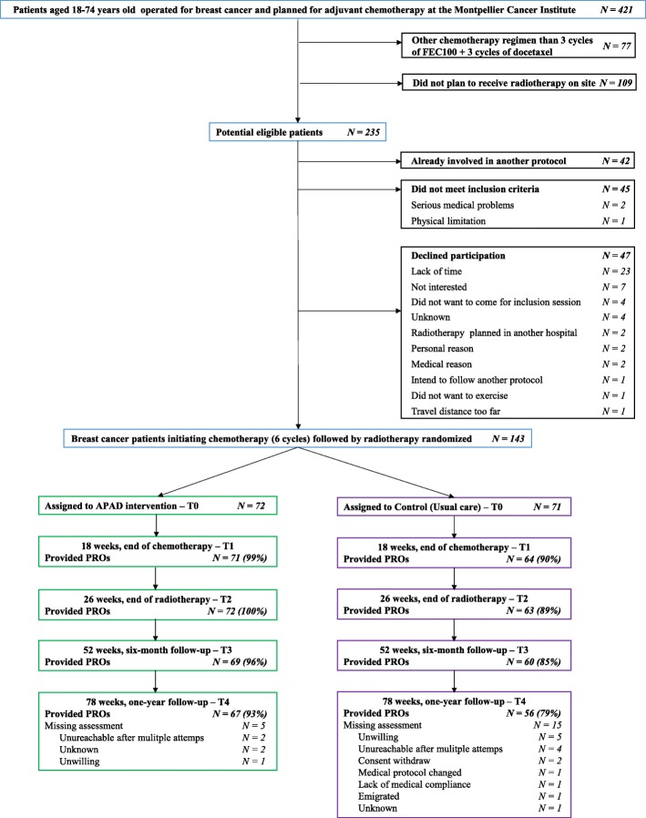 Results: Significant beneficial effects of the APAD intervention were observed on all PROs (i.e., fatigue, QoL, anxiety, depression) at 18 and 26 weeks. The significant effect on fatigue and QoL persisted up to 12-month follow-up. Significant decreases in BMI, fat mass, and increased muscle endurance and cognitive flexibility were observed at 26 weeks, but did not persist afterward. Leisure physical activity was enhanced in the APAD group vs UC group at 18 and 26 weeks. No significant effect of the intervention was found on major macronutrients intake.