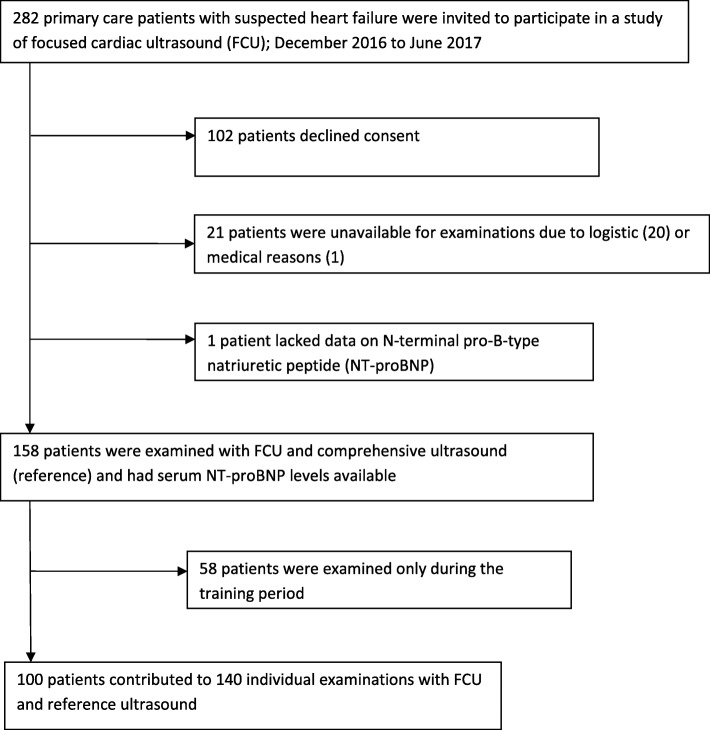 Methods: FCU performed by general practitioners (GPs)/GP registrars after a training programme comprising 20 supervised FCU examinations were compared with the corresponding results from conventional cardiac ultrasound by specialists. The agreement between groups of estimated LVEF < 50%, after visual assessment of global left ventricular function, was compared. Types of HF were determined according to the outcomes from the reference examinations and serum levels of natriuretic peptides (NT-proBNP).