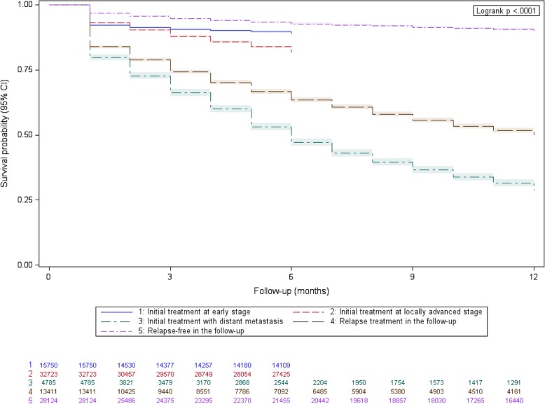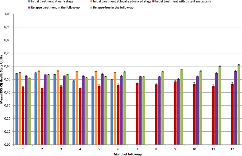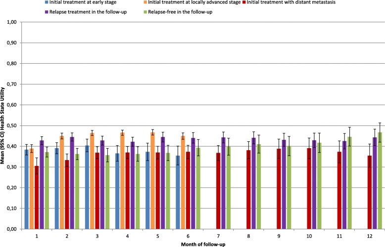 Results: Head and neck cancer was generally associated with poor HSU estimates in a real-life setting. As compared to "distant metastasis at initial treatment", mean HSU was higher in other health states, although numerical differences were small (0.45 versus around 0.54). It was primarily explained by the negative effects on HSU of an older age (38.4% aged ≥70 years in "early stage at initial treatment") and comorbidities (> 50% in other health states). HSU estimates significantly improved over time in the "relapse-free state" (from 8 to 12 months of follow-up).