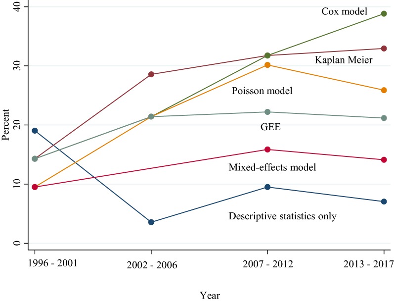 Results: Of 197 articles reviewed, the most commonly reported methods included contingency tables which comprised Pearson Chi-square, Fisher exact and McNemar's tests (n = 102, 51.8%), Student's t-tests (n = 82, 41.6%), followed by Cox models (n = 62, 31.5%) and Kaplan-Meier estimators (n = 59, 30.0%). The longitudinal analysis methods generalized estimating equations and mixed-effects models were reported in 41 (20.8%) and 24 (12.2%) articles, respectively, and increased in use over time. A positive trend in choice of more appropriate analytical methods was identified over time.