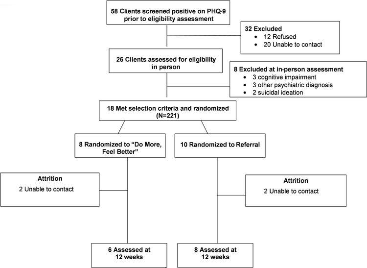 Methods: We trained 11 volunteers at two aging service settings in "Do More, Feel Better" and randomized 18 depressed clients to receive the intervention or referral to mental health services.