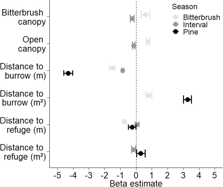 Results: Seasonality of food availability, food type, and spatial distribution of food largely influenced how individuals selected resources within their home ranges. Overall, when seeds were available, individuals mediated risks of predation and loss of food by using patches closer to refuge and selected intermediate distances to the burrow. When food was not available, individuals minimized exposure to heightened risk by staying close to the burrow and avoiding riskier patch types.
