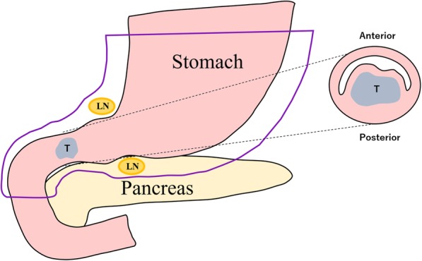 Case presentation: An 81-year-old man with a 1-month history of vomiting was admitted to our institution. Esophagogastroduodenoscopy (EGD) and computed tomography (CT) scans revealed an obstruction at the first part of the duodenum. A distal gastrectomy was performed for diagnostic and therapeutic purposes. The histopathological examination of the resected specimen showed adenocarcinoma that arose from an ectopic pancreas (Heinrich type 1). The patient is alive without relapse at 18 months of follow-up.