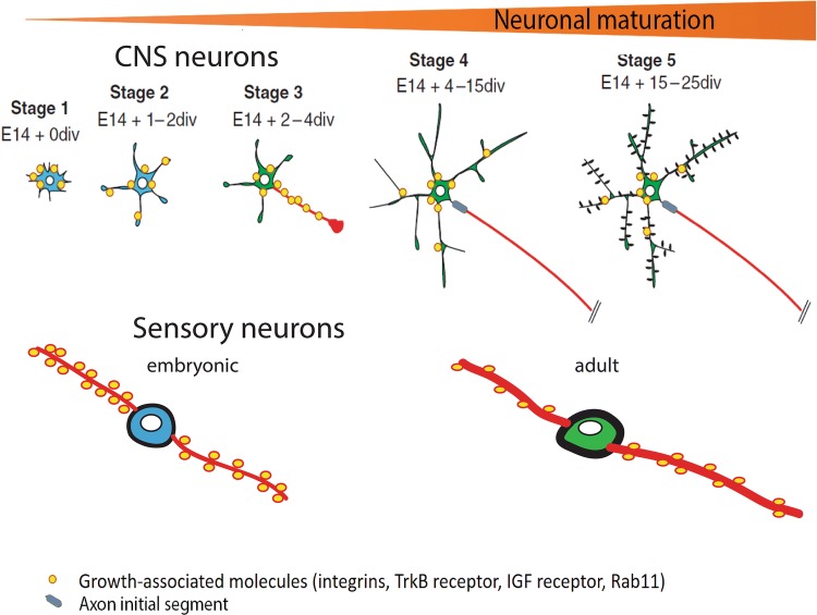 Axon regeneration in the CNS is inhibited by many extrinsic and intrinsic factors. Because these act in parallel, no single intervention has been sufficient to enable full regeneration of damaged axons in the adult mammalian CNS. In the external environment, NogoA and CSPGs are strongly inhibitory to the regeneration of adult axons. CNS neurons lose intrinsic regenerative ability as they mature: embryonic but not mature neurons can grow axons for long distances when transplanted into the adult CNS, and regeneration fails with maturity in in vitro axotomy models. The causes of this loss of regeneration include partitioning of neurons into axonal and dendritic fields with many growth-related molecules directed specifically to dendrites and excluded from axons, changes in axonal signalling due to changes in expression and localization of receptors and their ligands, changes in local translation of proteins in axons, and changes in cytoskeletal dynamics after injury. Also with neuronal maturation come epigenetic changes in neurons, with many of the transcription factor binding sites that drive axon growth-related genes becoming inaccessible. The overall aim for successful regeneration is to ensure that the right molecules are expressed after axotomy and to arrange for them to be transported to the right place in the neuron, including the damaged axon tip.
