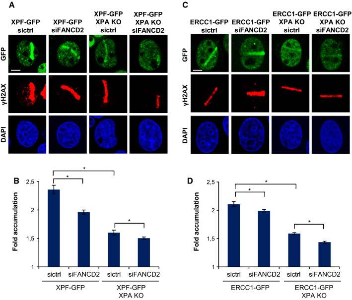 The effectiveness of many DNA-damaging chemotherapeutic drugs depends on their ability to form monoadducts, intrastrand crosslinks and/or interstrand crosslinks (ICLs) that interfere with transcription and replication. The ERCC1-XPF endonuclease plays a critical role in removal of these lesions by incising DNA either as part of nucleotide excision repair (NER) or interstrand crosslink repair (ICLR). Engagement of ERCC1-XPF in NER is well characterized and is facilitated by binding to the XPA protein. However, ERCC1-XPF recruitment to ICLs is less well understood. Moreover, specific mutations in XPF have been found to disrupt its function in ICLR but not in NER, but whether this involves differences in lesion targeting is unknown. Here, we imaged GFP-tagged ERCC1, XPF and ICLR-defective XPF mutants to investigate how in human cells ERCC1-XPF is localized to different types of psoralen-induced DNA lesions, repaired by either NER or ICLR. Our results confirm its dependence on XPA in NER and furthermore show that its engagement in ICLR is dependent on FANCD2. Interestingly, we find that two ICLR-defective XPF mutants (R689S and S786F) are less well recruited to ICLs. These studies highlight the differential mechanisms that regulate ERCC1-XPF activity in DNA repair.