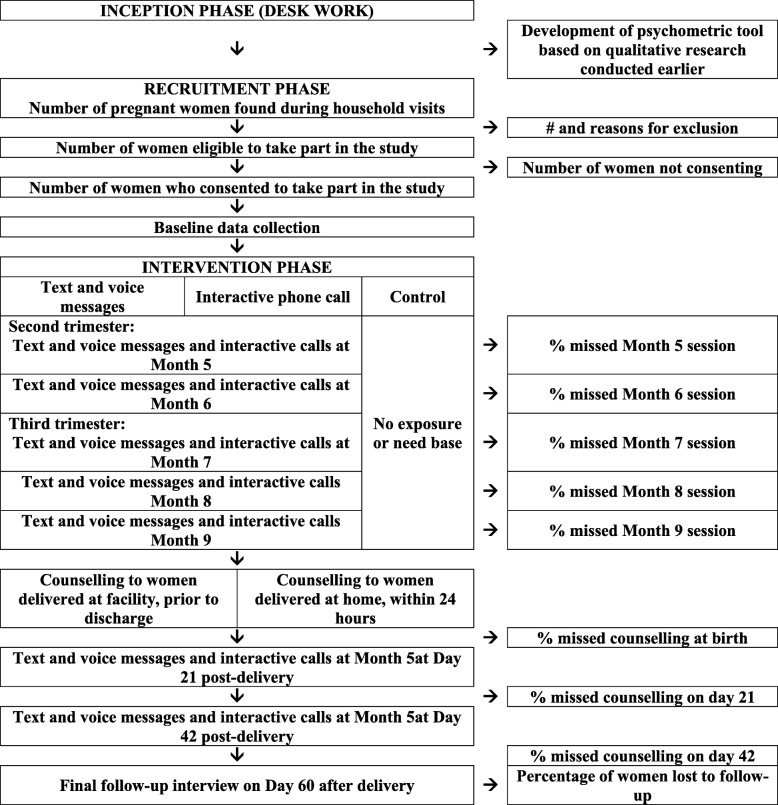 Discussion: The study findings will highlight effectiveness of mobile phone in raising awareness of maternal health and contraception, which in turn, is expected to be translated into increased proportion of: at least four antenatal visits, skilled birth or institutional delivery, postpartum contraceptive use, postnatal check-up, child immunization, and breastfeeding. Moreover, if the text and voice messages approach is proven to be non-inferior to interactive calls, it will provide evidence to making promotion of healthcare less resource intensive, and thereby contribute in improving the efficiency of the healthcare system.