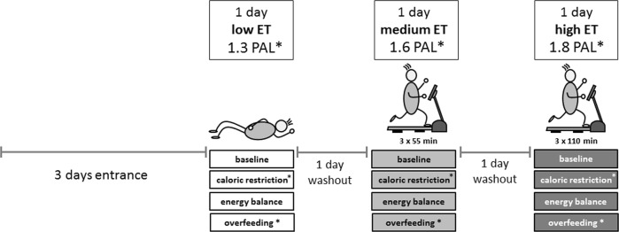Objective: Sedentary lifestyle increases the risk of type 2 diabetes. The aim of this study was to investigate the impact of different levels of energy turnover (ET; low, medium, and high level of physical activity and the corresponding energy intake) on glucose metabolism at zero energy balance, caloric restriction, and overfeeding.