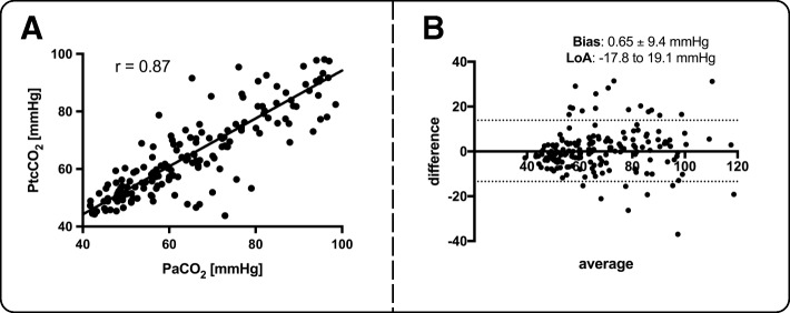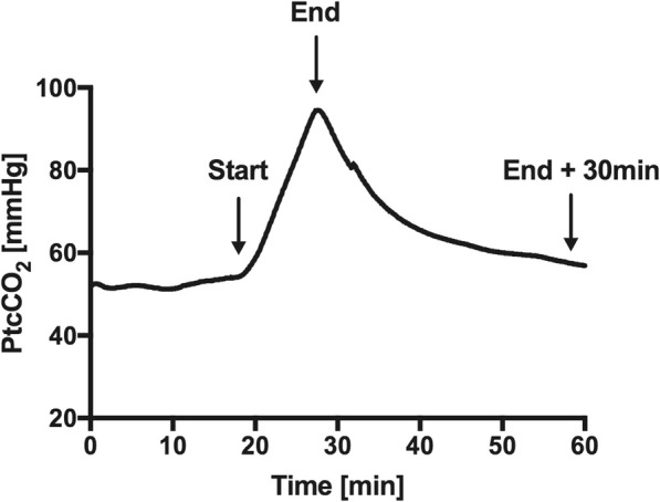 Results: The mean intervention time during all procedures was 10 ± 3 min. The combination of low tidal volumes and ETs of 7.5 mm internal diameter resulted in the most profound increase in PaCO2 (32.2 ± 11.6 mmHg) and decrease in pH-value (- 0.18 ± 0.05). In contrast, the combination of high tidal volumes and ETs of 8.5 mm internal diameter resulted in the least profound increase in PaCO2 (8.8 ± 9.0 mmHg) and decrease of pH (- 0.05 ± 0.04). The intervention-related increase in PaCO2 was significantly lower when using higher tidal volumes for larger ET: internal diameter 7.5, 8.0 and 8.5: P > 0.05, =0.006 and = 0.002, respectively. Transcutaneous PCO2 monitoring revealed steadily worsening hypercapnia during the intervention with a high correlation of 0.87 and a low bias of 0.7 ± 9.4 mmHg according to the Bland-Altman analysis when compared to PaCO2 measurements.