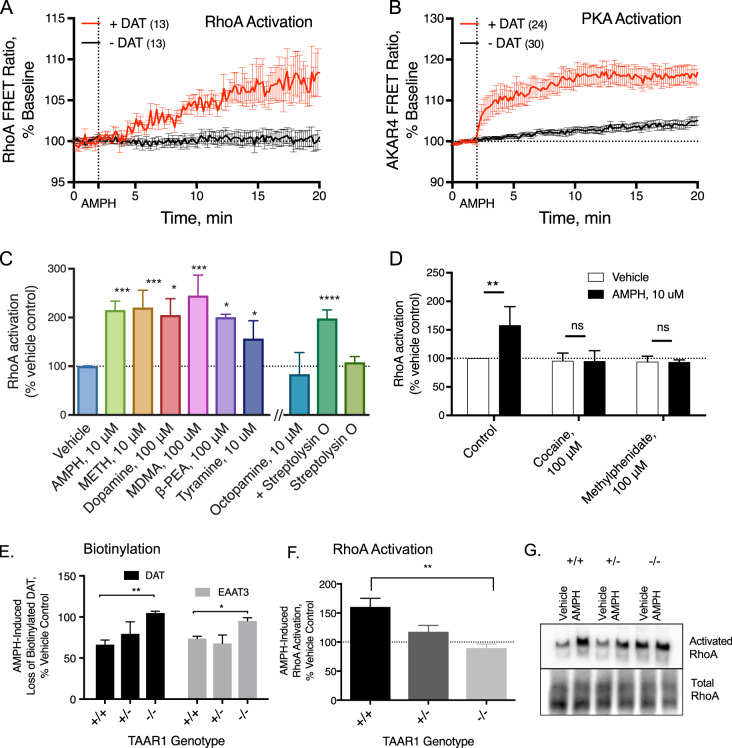 The extensive use of amphetamines to treat attention deficit hyperactivity disorders in children provides a compelling rationale for understanding the mechanisms of action of amphetamines and amphetamine-related drugs. We have previously shown that acute amphetamine (AMPH) regulates the trafficking of both dopamine and glutamate transporters in dopamine neurons by increasing activation of the small GTPase RhoA and of protein kinase A. Here we demonstrate that these downstream signaling events depend upon the direct activation of a trace amine-associated receptor, TAAR1, an intracellular G-protein coupled receptor (GPCR) that can be activated by amphetamines, trace amines, and biogenic amine metabolites. Using cell lines and mouse lines in which TAAR1 expression has been disrupted, we demonstrate that TAAR1 mediates the effects of AMPH on both RhoA and cAMP signaling. Inhibition of different Gα signaling pathways in cell lines and in vivo using small cell-permeable peptides confirms that the endogenous intracellular TAAR1 couples to G13 and to GS α-subunits to increase RhoA and PKA activity, respectively. Results from experiments with RhoA- and PKA-FRET sensors targeted to different subcellular compartments indicate that AMPH-elicited PKA activation occurs throughout the cell, whereas G13-mediated RhoA activation is concentrated near the endoplasmic reticulum. These observations define TAAR1 as an obligate intracellular target for amphetamines in dopamine neurons and support a model in which distinct pools of TAAR1 mediate the activation of signaling pathways in different compartments to regulate excitatory and dopaminergic neurotransmission.