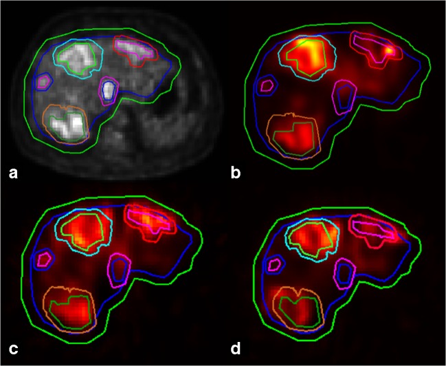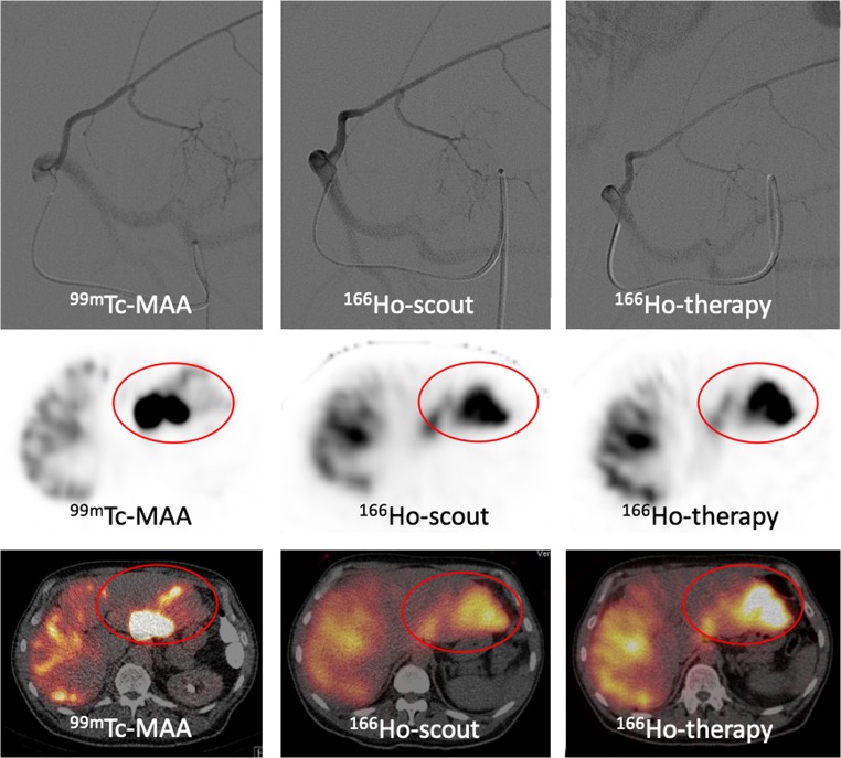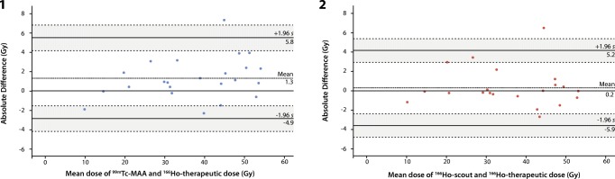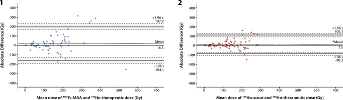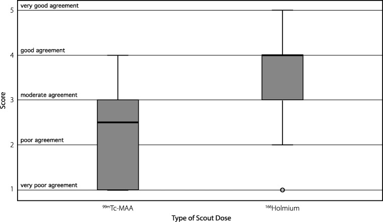 Results: A total of 23 procedures (71 lesions, 22 patients) were included for analysis. In the qualitative analysis, 166Ho-scout was superior with a median score of 4 vs. 2.5 for 99mTc-MAA (p < 0.001). The quantitative analysis showed significantly narrower 95%-limits of agreement for 166Ho-scout in comparison with 99mTc-MAA when evaluating lesion absorbed dose (- 90.3 and 105.3 Gy vs. - 164.1 and 197.0 Gy, respectively). Evaluation of normal liver absorbed dose did not show difference in agreement between both scout doses and 166Ho-therapeutic dose (- 2.9 and 5.5 Gy vs - 3.6 and 4.1 Gy for 99mTc-MAA and 166Ho-scout, respectively).