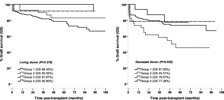 Results: Of 255 patients who received a kidney from a living donor (LD), 42 (16.47%) from all groups (G) had T-cell-mediated rejection (TCMR) and four (G1) lost their grafts, 8 (3.14%) had antibody-mediated rejection (AMR), and two lost their graft in G1 and G4. Of 214 patients who received a kidney from deceased donors (DD), 37 (17.29%) had TCMR with one lost graft in G1. AMR was shown in 13 (6.07%) patients, with three losses observed in G2. Statistical differences between the groups in the 9-year graft survival rate were found only in the comparison of G1 versus G2 (P = 0.005) and G2 versus G4 (P = 0.047) for DD. For LD, no statistical differences were found.