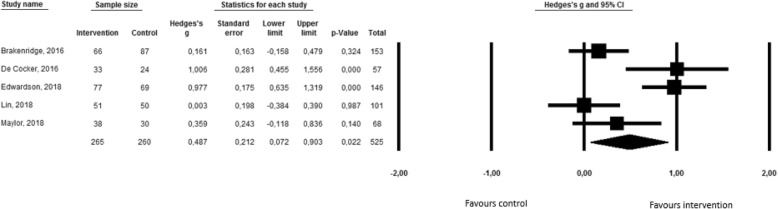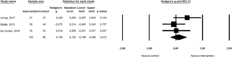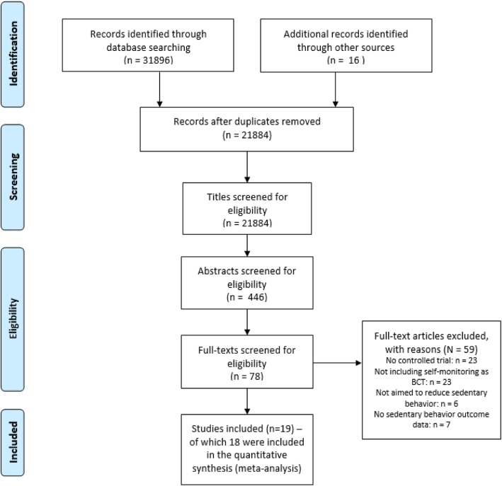 Conclusions: Despite the small sample sizes, and the large heterogeneity, results of the current meta-analysis suggested that interventions using self-monitoring as a behavior change technique have the potential to reduce sedentary behavior in adults. If future - preferably large-scale studies - can prove that the reductions in sedentary behavior are attributable to self-monitoring and can confirm the sustainability of this behavior change, multi-level interventions including self-monitoring may impact public health by reducing sedentary behavior.