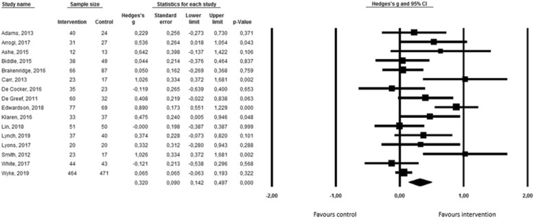 Results: Nineteen intervention studies with a total of 2800 participants met the inclusion criteria. Results of the meta-analyses showed that interventions using self-monitoring significantly reduced total sedentary time (Hedges g = 0,32; 95% CI = 0,14 - 0,50; p = 0,001) and occupational sedentary time (Hedge's g = 0,56; 95% CI = 0,07 - 0,90; p = 0,02) on the short term. Subgroup analyses showed that significant intervention effects were only found if objective self-monitoring tools were used (g = 0,40; 95% CI = 0,19 - 0,60; p < 0,001), and if the intervention only targeted sedentary behavior (g = 0,45; 95% CI = 0,15-0,75; p = 0,004). No significant intervention effects were found on the number of breaks in sedentary behavior.