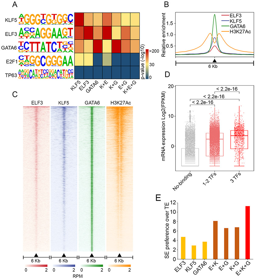 Results: We found widespread and pervasive alterations of the (super)-enhancer reservoir in both subtypes of oesophageal cancer, leading to transcriptional activation of a myriad of novel oncogenes and signalling pathways, some of which may be exploited pharmacologically (eg, leukemia inhibitory factor (LIF) pathway). Focusing on EAC, we bioinformatically reconstructed and functionally validated an interconnected circuitry formed by four master TFs-ELF3, KLF5, GATA6 and EHF-which promoted each other's expression by interacting with each super-enhancer. Downstream, these master TFs occupied almost all EAC super-enhancers and cooperatively orchestrated EAC transcriptome. Each TF within the transcriptional circuitry was highly and specifically expressed in EAC and functionally promoted EAC cell proliferation and survival.