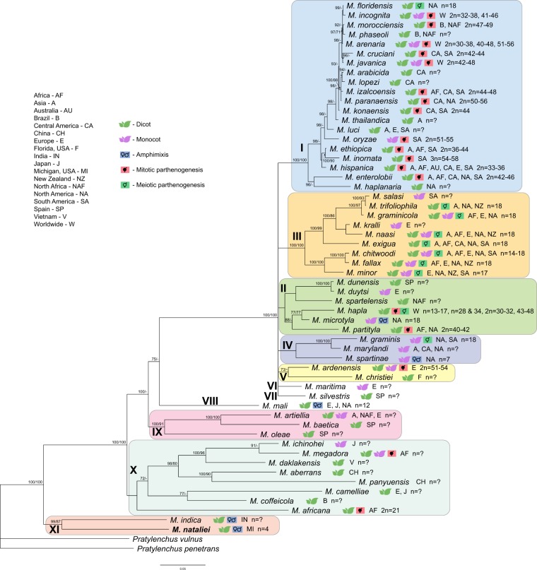 The root-knot nematodes of the genus Meloidogyne are highly adapted, obligate plant parasites, consisting of nearly one hundred valid species, and are considered the most economically important group of plant-parasitic nematodes. Six Meloidogyne species: M. arenaria, M. hapla, M. incognita, M. microtyla, M. naasi and M. nataliei were previously reported in Michigan, USA. For this study, Meloidogyne nataliei was isolated from the grapevine Vitis labrusca from the type locality in Michigan, USA, and was characterized using isozyme analysis and ribosomal and mitochondrial gene sequences. No malate dehydrogenase activity was detected using macerate of one, five, six, seven or ten females of M. nataliei per well. However, one strong band (EST = S1; Rm: 27.4) of esterase activity was detected when using homogenates of ten egg-laying females per well. Phylogenetic analyses of sequences of the partial 18S ribosomal RNA, D2-D3 of 28S rRNA, internal transcribed spacer of rRNA, mitochondrial cytochrome oxidase subunit I genes and the cytochrome oxidase subunit II-16S rRNA intergeneric fragment from fifty-five valid Meloidogyne species and M. nataliei were conducted using Bayesian inference and maximum likelihood methods. From these results, we infer 11 distinct clades among studied species, with M. nataliei and M. indica composing a basal lineage. Seventy five percent of these species belong to seven clades within the Meloidogyne superclade. Characterization of these clades is provided and evolutionary trends within the root-knot nematodes are discussed.