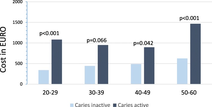 Results: Treatment costs showed to be twice as high in the caries active group compared to the caries inactive group and were three times higher in the caries active age group 20-29 compared to the caries inactive age group 20-29. Differences between the groups was found for number of intact teeth according to age groups. In the EQ-5D-5 L instrument, more problems relating to the dimension anxiety/depression was seen in the caries active group. QALY weights showed tendencies (non-significant) to be lower in the caries active group.