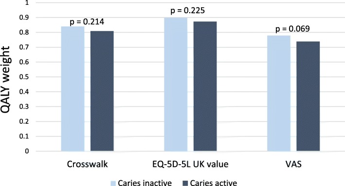 Background: Dental caries remains a common and expensive disease for both society and affected individuals. Furthermore, caries often affect individuals' health-related quality of life (HRQoL). Health economic evaluations are needed to understand how to efficiently distribute dental care resources. This study aims to evaluate treatment costs and QALY weights for caries active and inactive adult individuals, and to test whether the generic instrument EQ-5D-5 L can distinguish differences in this population.