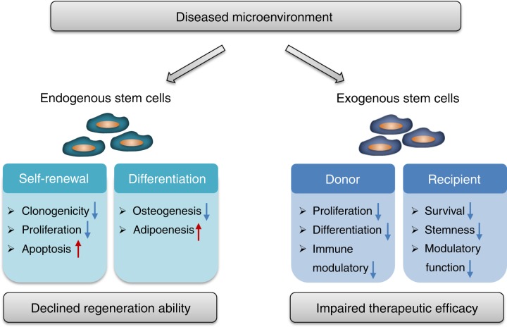 In modern medicine, bone and dental loss and defects are common and widespread morbidities, for which regenerative therapy has shown great promise. Mesenchymal stem cells, obtained from various sources and playing an essential role in organ development and postnatal repair, have exhibited enormous potential for regenerating bone and dental tissue. Currently, mesenchymal stem cells (MSCs)-based bone and dental regeneration mainly includes two strategies: the rescue or mobilization of endogenous MSCs and the application of exogenous MSCs in cytotherapy or tissue engineering. Nevertheless, the efficacy of MSC-based regeneration is not always fulfilled, especially in diseased microenvironments. Specifically, the diseased microenvironment not only impairs the regenerative potential of resident MSCs but also controls the therapeutic efficacy of exogenous MSCs, both as donors and recipients. Accordingly, approaches targeting a diseased microenvironment have been established, including improving the diseased niche to restore endogenous MSCs, enhancing MSC resistance to a diseased microenvironment and renormalizing the microenvironment to guarantee MSC-mediated therapies. Moreover, the application of extracellular vesicles (EVs) as cell-free therapy has emerged as a promising therapeutic strategy. In this review, we summarize current knowledge regarding the tactics of MSC-based bone and dental regeneration and the decisive role of the microenvironment, emphasizing the therapeutic potential of microenvironment-targeting strategies in bone and dental regenerative medicine.