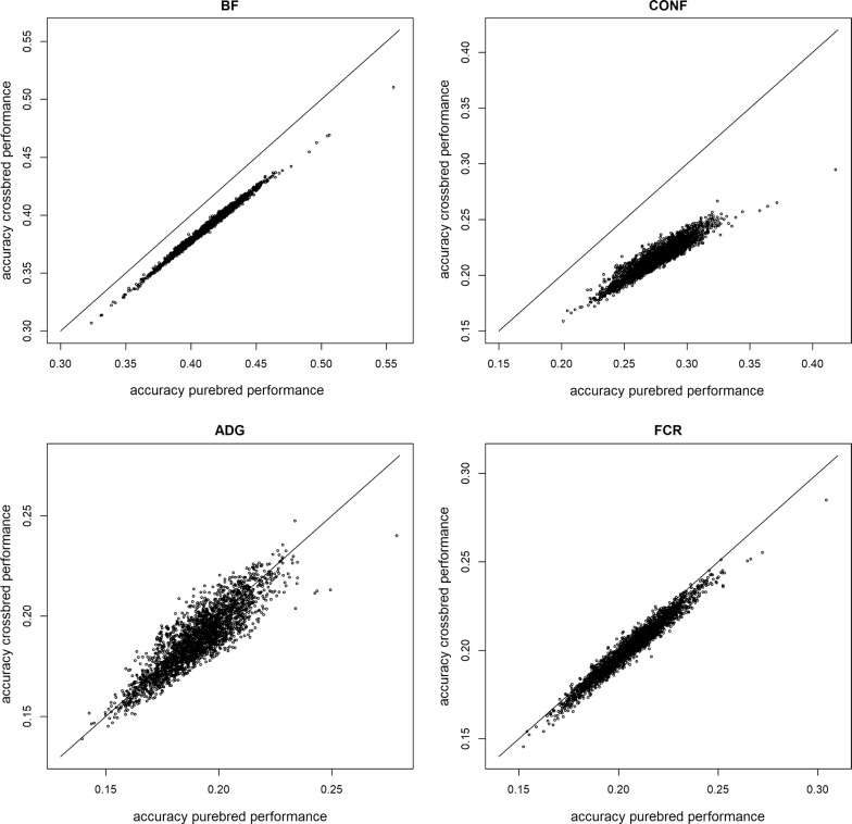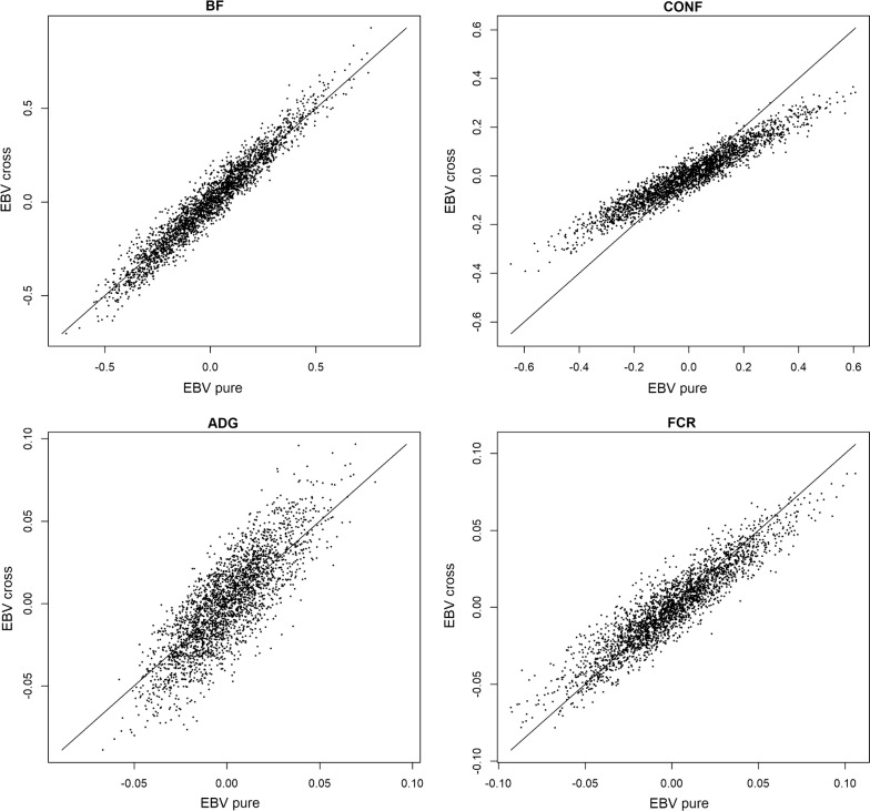 Results: Additive genetic correlations (with associated standard errors) between purebred and crossbred performances were equal to 0.96 (0.07), 0.83 (0.16), 0.75 (0.17), and 0.87 (0.18) for BF, CONF, ADG, and FCR, respectively. For BF, ADG, and FCR, the additive genetic variance was smaller for purebred performance than for crossbred performance, but for CONF the reverse was observed. EBV on Duroc boars were more accurate for purebred performance than for crossbred performance for BF, CONF and FCR, but not for ADG.