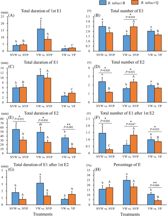 Methods: We used the electrical penetration graph (EPG) to investigate the effect of CCYV on the feeding behaviors of B. tabaci biotypes B and Q.