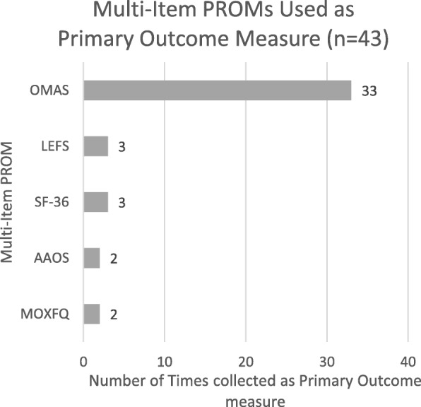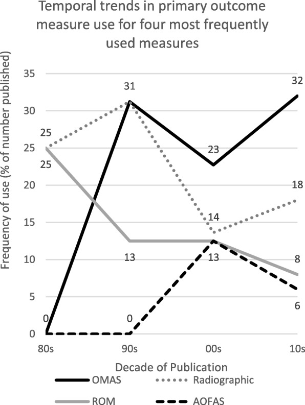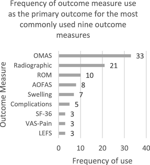 Results: The searches returned a total of 3380 records. Following application of the eligibility criteria, 121 records were eligible for inclusion in this review. The most frequently collected primary outcome measures in this type of publication was the Olerud Molander Ankle Score, followed by radiographic and range of movement assessments. There was a total of 28 different outcome measures collected and five different multi-item, patient reported outcome measures collected as the primary outcome measure. There was a sequential increase in the number of this type of study published per decade since the 1980's.