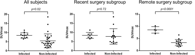 Conclusions: Results suggest that FDG-PET/CT may be useful for the diagnosis of SWI with optimal diagnostic accuracy achieved by identifying specific patterns of uptake. SUVmax can be helpful in assessing subjects with remote surgery, but its use is limited in the context of recent surgery. Further studies are required to confirm these results.