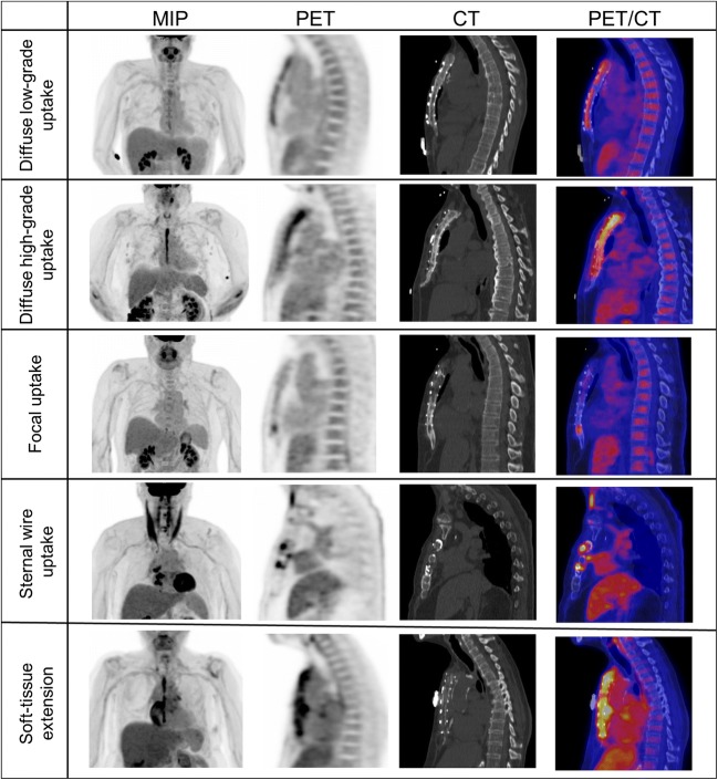 Methods: We performed a single-center, retrospective analysis of patients who had undergone median sternotomy and FDG-PET/CT imaging. The gold standard consisted of positive bacterial culture and/or the presence of purulent material at surgery. Qualitative patterns of sternal FDG uptake, SUVmax, and associated CT findings were determined, and an imaging scoring system was developed. The diagnostic performances were studied in both the recent (≤ 6 months between sternotomy and imaging) and remote surgery phase (> 6 months).
