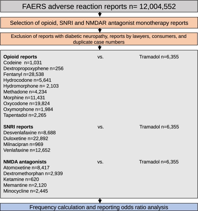 Tramadol is one of the most commonly used analgesics worldwide, classified as having a low abuse potential by U.S. Drug Enforcement Agency, and often recommended in pain management guidelines. Its pain-relieving mechanism of action is attributed to mild μ-opioid receptor agonism, serotonin and norepinephrine mediated nociception modulation, and N-methyl-D-aspartate receptor, NMDAR, antagonism. However, recent case reports and case-control studies have shown an association between tramadol use and hypoglycemia. The growing concern over increasing tramadol use and unexpected side effects warranted a further comparative and quantitative analysis of tramadol adverse reactions. In this study we analyzed over twelve million reports from United States Food and Drug Administration Adverse Event Reporting System and provided evidence of increased propensity for hypoglycemia in patients taking tramadol when compared to patients taking other opioids, serotonin-norepinephrine reuptake inhibitors, and drugs affecting NMDAR activity. Additionally, we identified that only methadone from the opioid cohort behaves similarly to tramadol and has an association with hypoglycemia.
