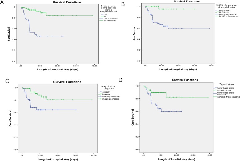 Results: A total of 116 eligible stroke patients were followed over 4 months. The mean age of patients was 55.1 + 14.0 years and males comprised of 73 (62.9%). Stroke accounted for 16.5% of total medical admissions. Among the 116 patients with stroke, 91 (78.4%) were discharged alive making in hospital mortality rate of 25 (21.6%). The median time of in hospital mortality and length of hospital stay after admission of the patients were 4.38 days and 9.21 days, respectively. The prominent suspected immediate cause for in hospital mortality was increased intracranial pressure in 17 (68.0%) followed by respiratory failure secondary to aspiration pneumonia in 11 (44.0%) patients. Brain edema (AHR: 6.27, 95% CI: 2.50-15.76), urine incontinence (AHR: 3.48, 95% CI: 1.48-8.17), National Institute of Health Stroke Scale (NIHSS) > 13 during hospital arrival (AHR: 22.58, 95% CI: 2.95-172.56) and diagnosis of stroke clinically alone (AHR: 4.96, 95% CI: 1.96-12.54) were the independent predictors of time to in hospital mortality.