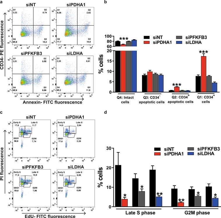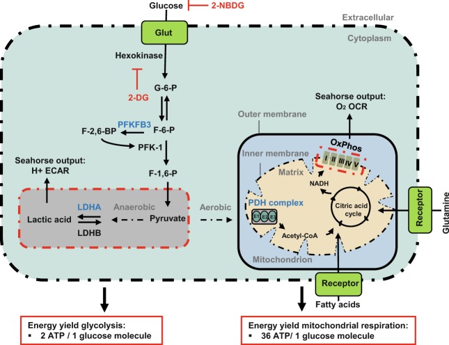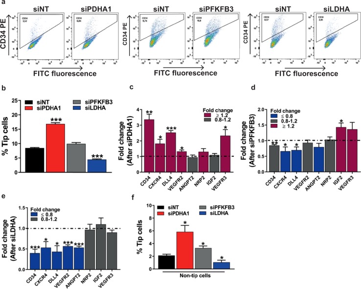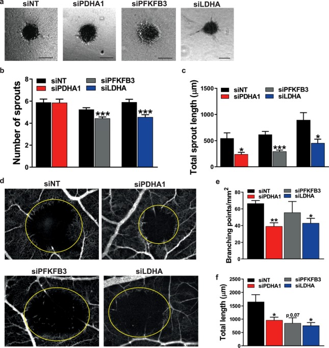 During sprouting angiogenesis, an individual endothelial tip cell grows out from a pre-existing vascular network and guides following and proliferating stalk cells to form a new vessel. Metabolic pathways such as glycolysis and mitochondrial respiration as the major sources of adenosine 5'-triphosphate (ATP) for energy production are differentially activated in these types of endothelial cells (ECs) during angiogenesis. Therefore, we studied energy metabolism during angiogenesis in more detail in tip cell and non-tip cell human umbilical vein ECs. Small interfering RNA was used to inhibit transcription of glycolytic enzymes PFKFB3 or LDHA and mitochondrial enzyme PDHA1 to test whether inhibition of these specific pathways affects tip cell differentiation and sprouting angiogenesis in vitro and in vivo. We show that glycolysis is essential for tip cell differentiation, whereas both glycolysis and mitochondrial respiration occur during proliferation of non-tip cells and in sprouting angiogenesis in vitro and in vivo. Finally, we demonstrate that inhibition of mitochondrial respiration causes adaptation of EC metabolism by increasing glycolysis and vice versa. In conclusion, our studies show a complex but flexible role of the different metabolic pathways to produce ATP in the regulation of tip cell and non-tip cell differentiation and functioning during sprouting angiogenesis.